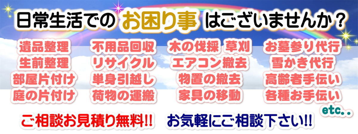家財の整理・分別・梱包・搬出撤去・部屋清掃作業、買取・リサイクル、物置解体撤去、庭周りの片付け作業。